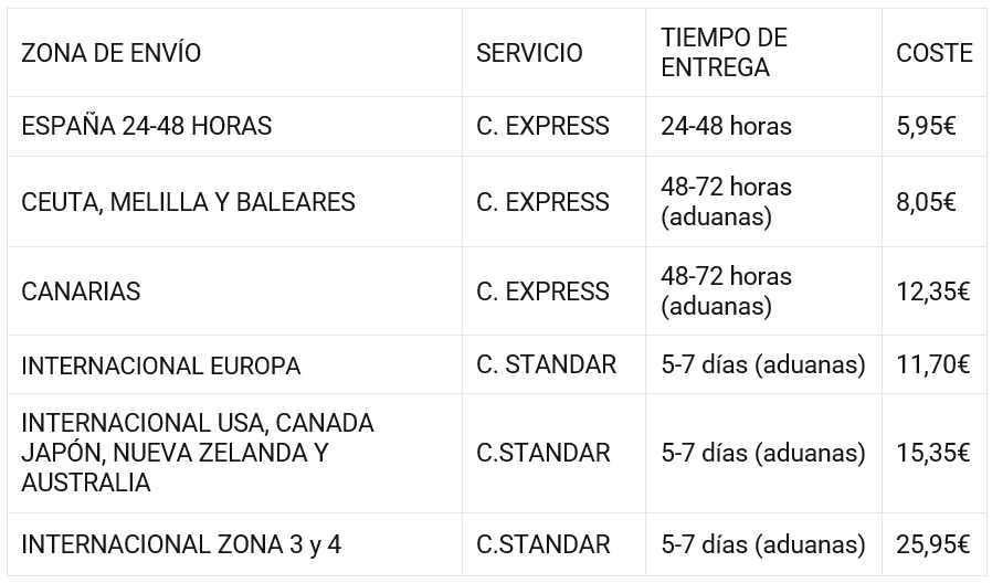 Keep in mind that the delivery times and prices presented in the table below are estimates, the exact cost of your delivery will be calculated once you have provided your complete delivery address and before making your automatic payment on the web.
